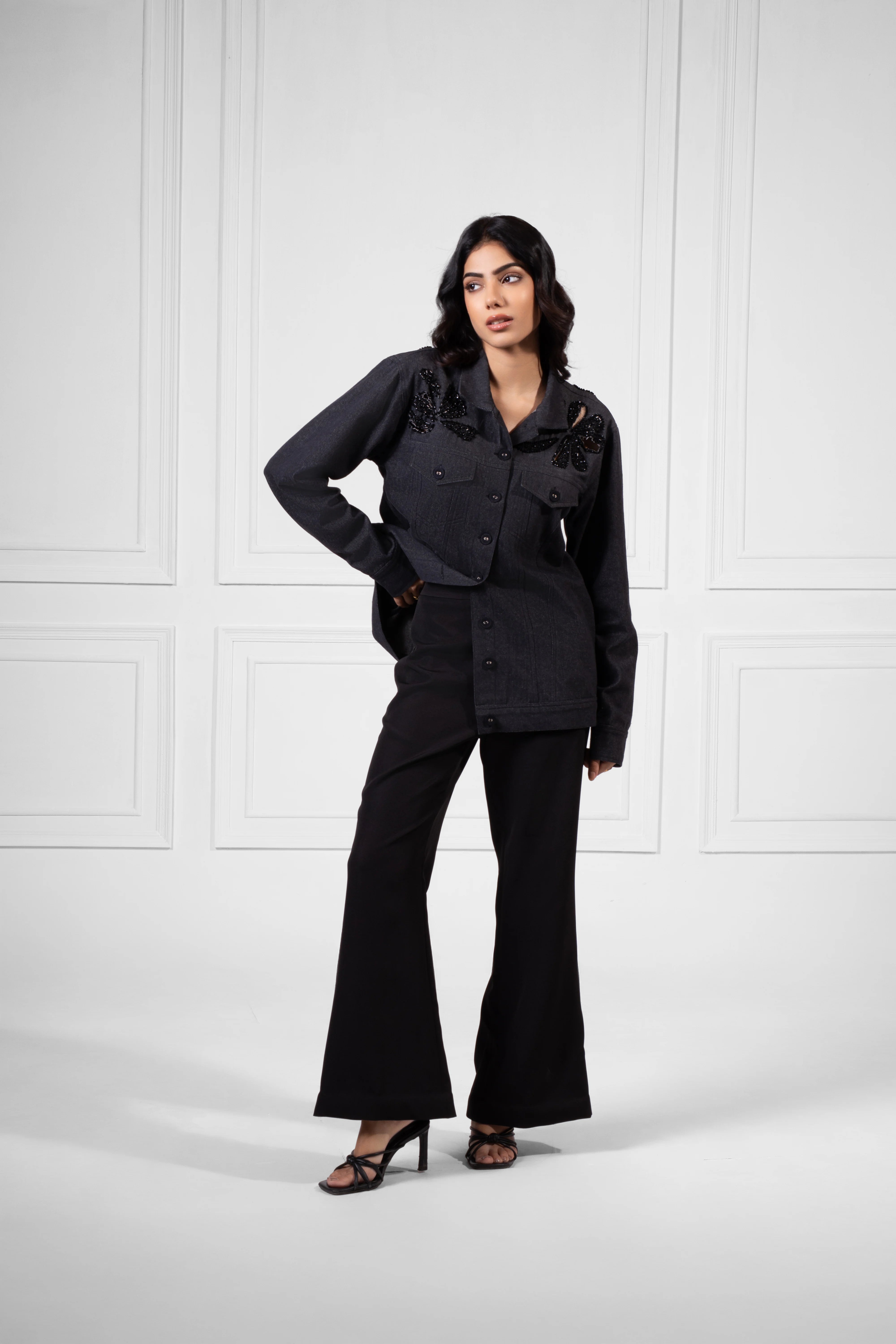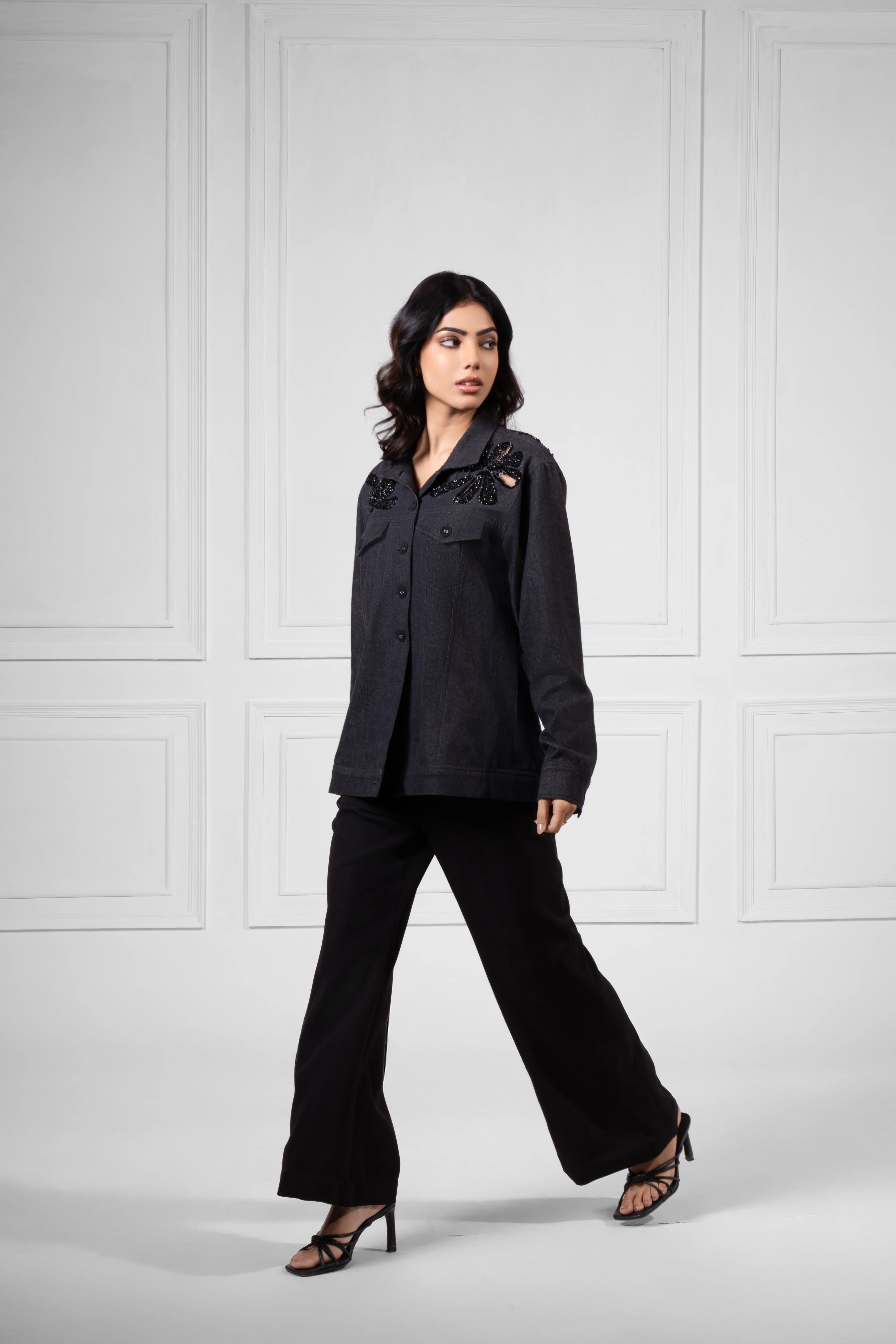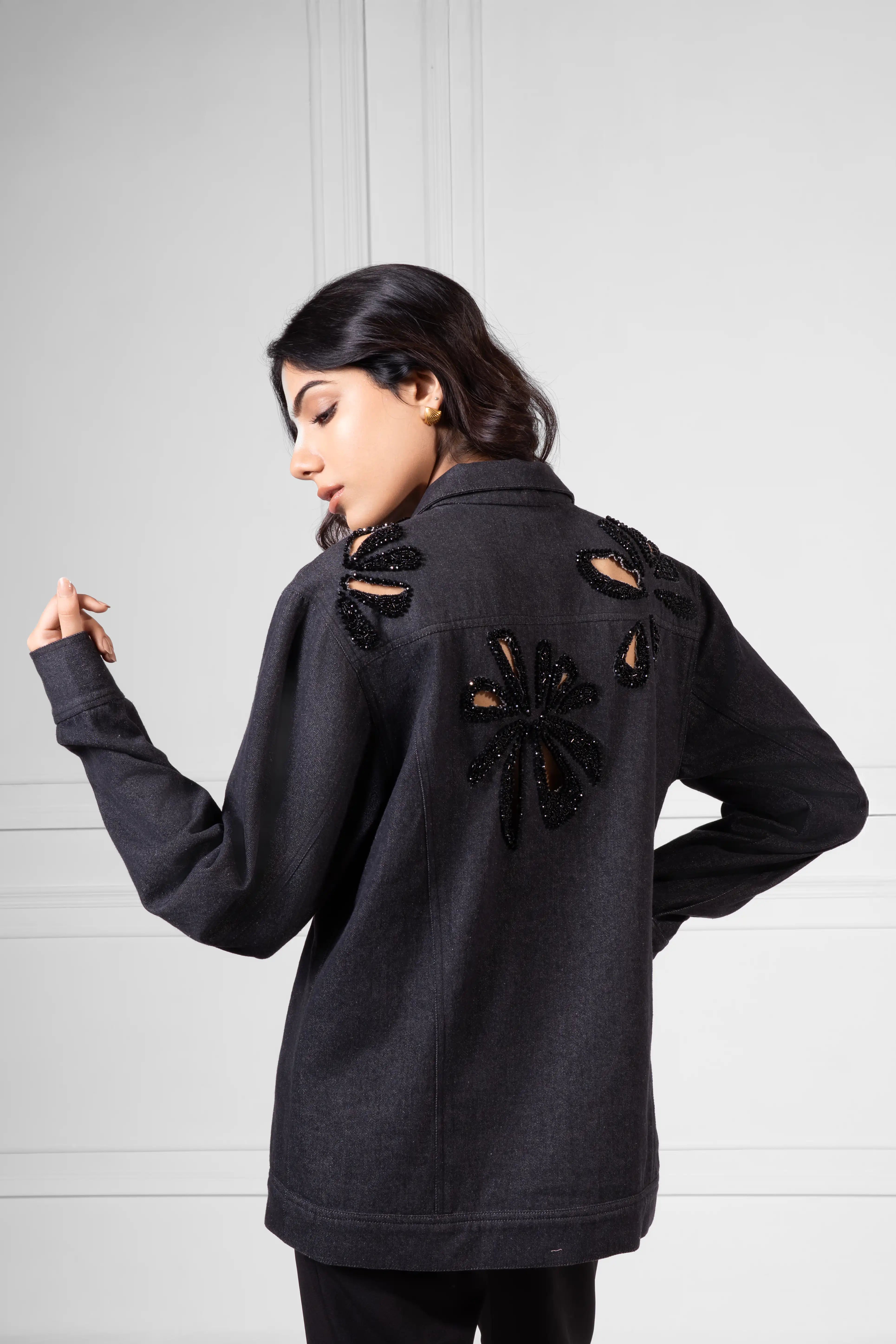 Black denim jacket, oversized with a clean button-front silhouette. Cutwork florals edged in hand embroidery add dimension across the yoke and back, balancing structure with movement.